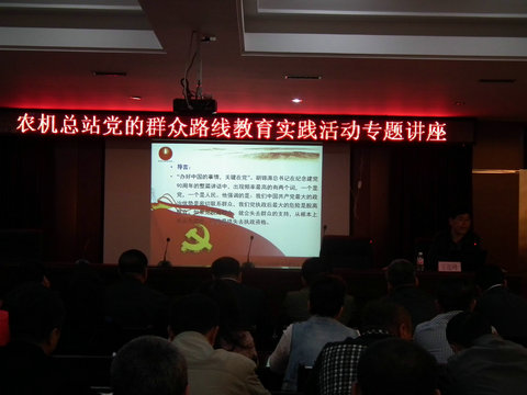 为保障党的群众路线教育实践活动学习教育环节的深入推进,确保农机系统党员特别是党员领导干部全面领会群众路线教育实践活动的重要意义,提升党员干部理论水平,促进党员干部以强烈的责任感、使命感积极主动的投身教育实践活动。4月25日上午,洮北区农机管理总站特邀区委党校王连峰副校长为全站党员干部作了关于“对党的群众路线教育实践活动认识”的专题讲座。
